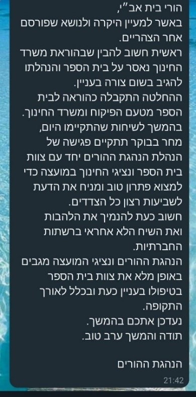 מצד שני, יצאה הודעה שנייה מוועד ההורים לאחר יום
