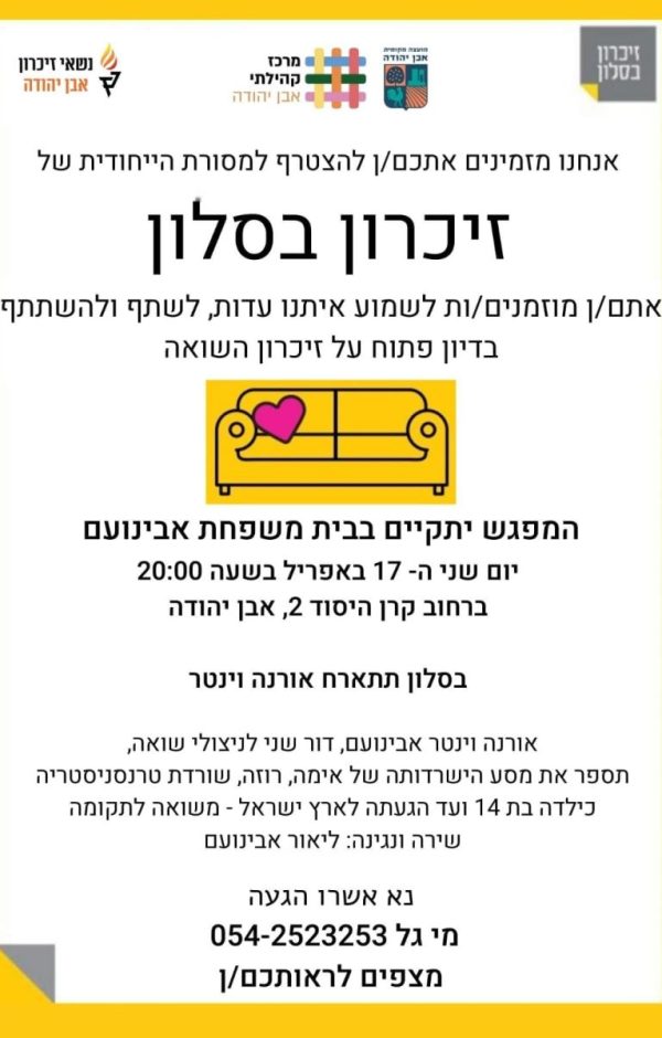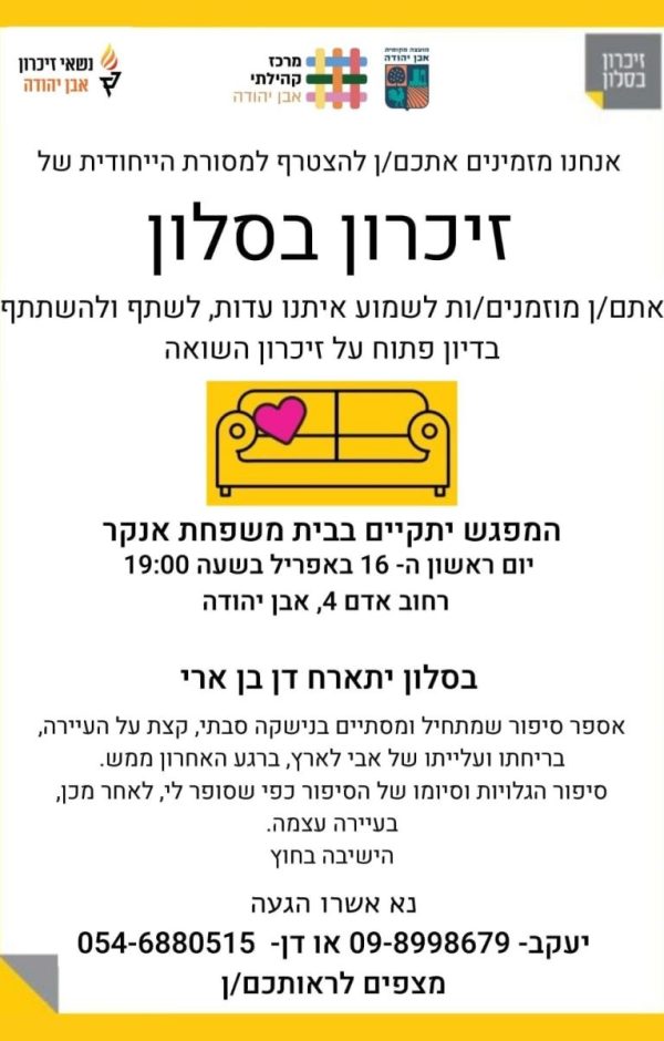 כחלק מארועי הזיכרון באבן יהודה, יתקיימו במשך השבוע ארועי "זיכרון בסלון" בסלונם של עשרות תושבים לסיפורי עדות.